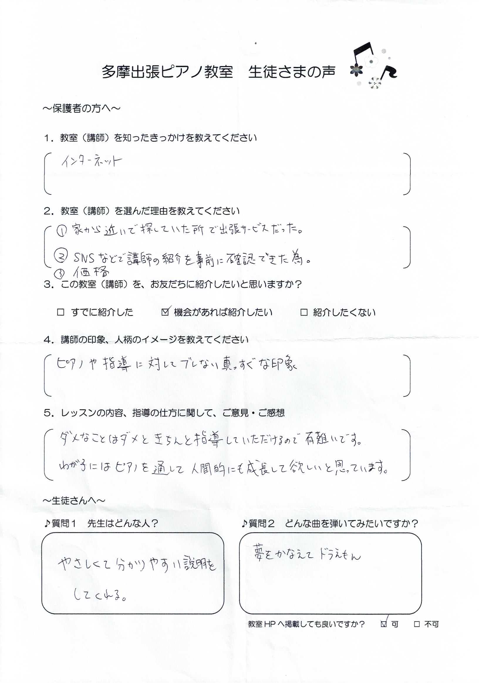 娘の今の進み具合を的確にお伝えいただき、とてもわかりやすいです。娘もピアノが上達していることに自信をもっているようです!レッスンのスピードや娘のピアノへの向き合い方にも寄り添ってくださり、とても感謝しています。