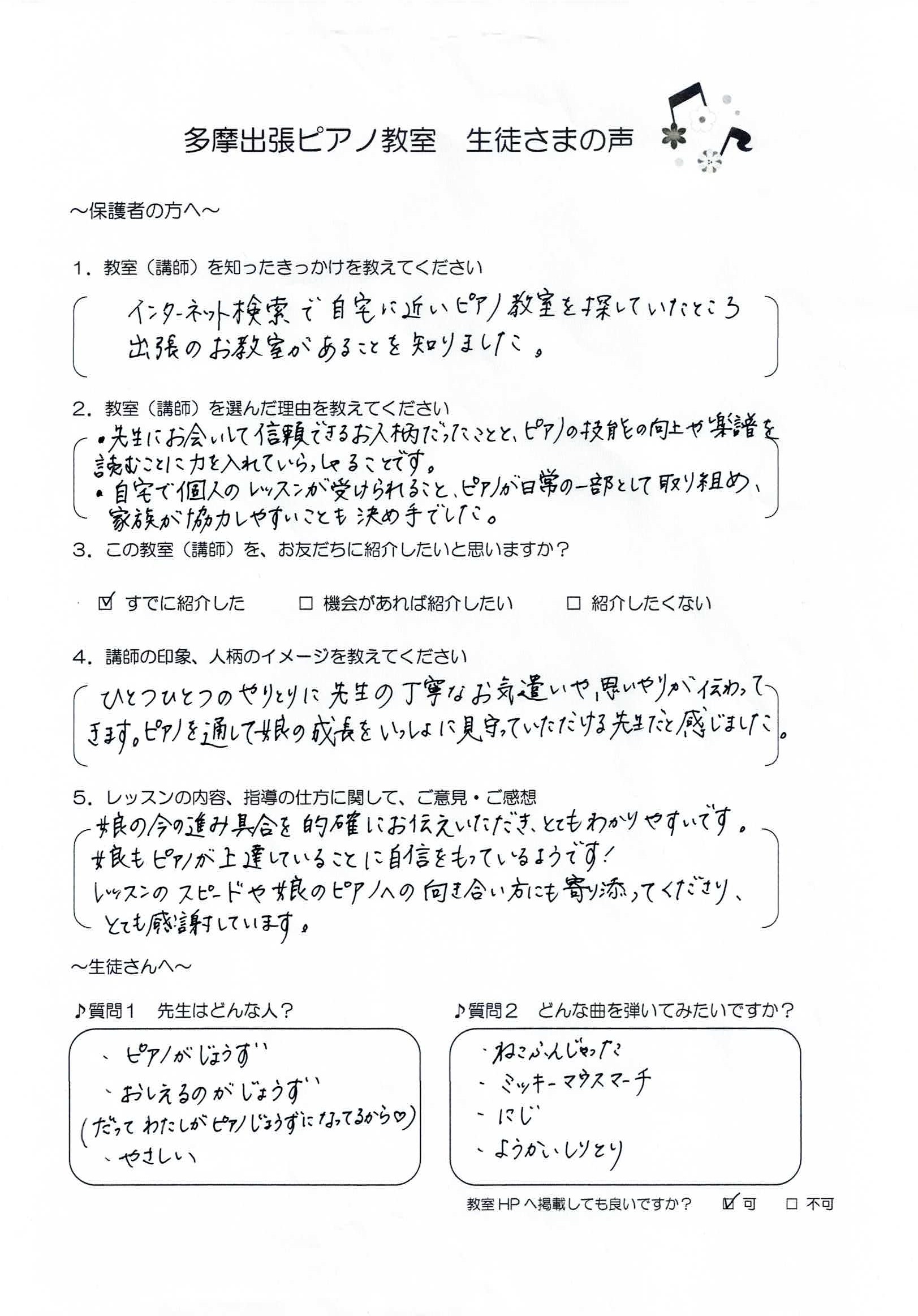 娘の今の進み具合を的確にお伝えいただき、とてもわかりやすいです。娘もピアノが上達していることに自信をもっているようです!レッスンのスピードや娘のピアノへの向き合い方にも寄り添ってくださり、とても感謝しています。